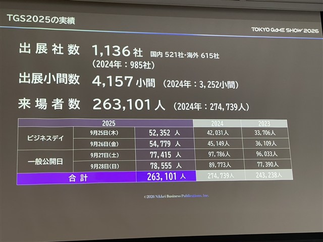 田辺氏はまず、昨年「東京ゲームショウ2025」の出展社数や来場者数などの実績を振り返った。