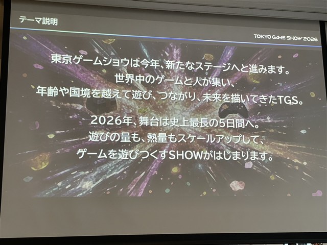 「東京ゲームショウ2026」のテーマは、“史上最長、遊びづくしの5DAYS“と発表。スケールアップする東京ゲームショウに期待してほしいと田辺氏は話した。