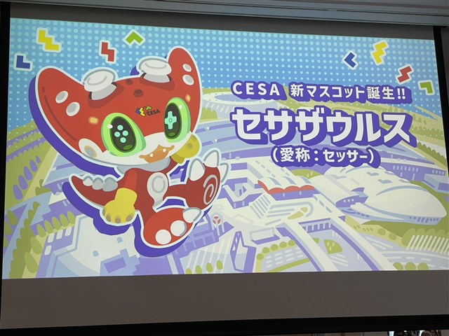 ここで、CESA設立30周年を記念して、新たなマスコットキャラクター「セサザウルス(愛称:セッサー)」を公開した。「東京ゲームショウ」を今まで以上に身近なイベントして認知してもらえるよう、700件以上の公募の中から選出されたという。
