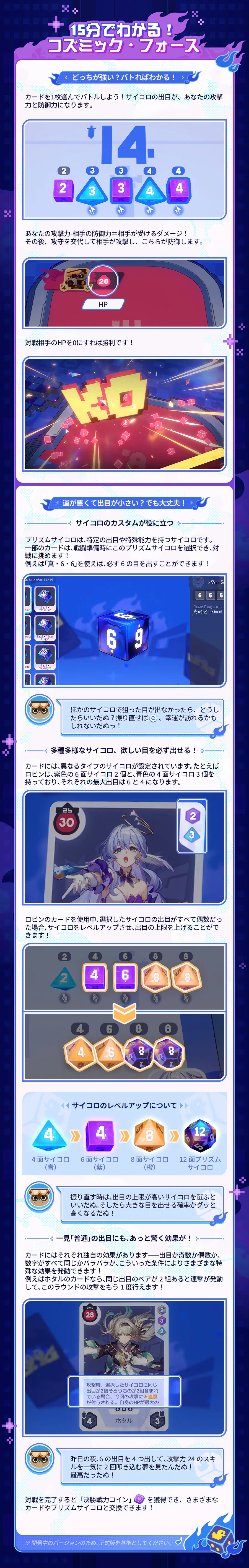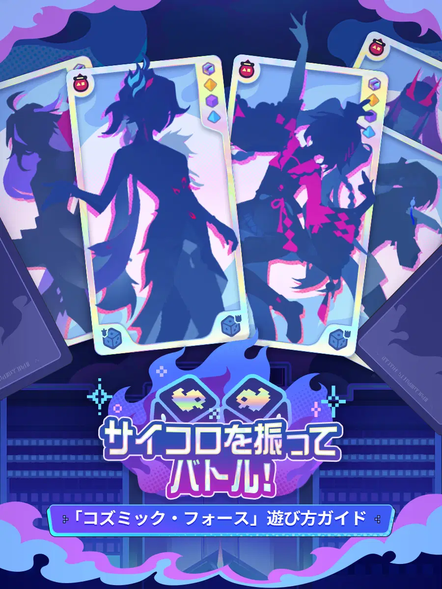 ● 「コズミック・フォース」では、集めたキャラカードを使って、相手と対戦を繰り広げ、カードについているサイコロを駆使して攻防を行います。