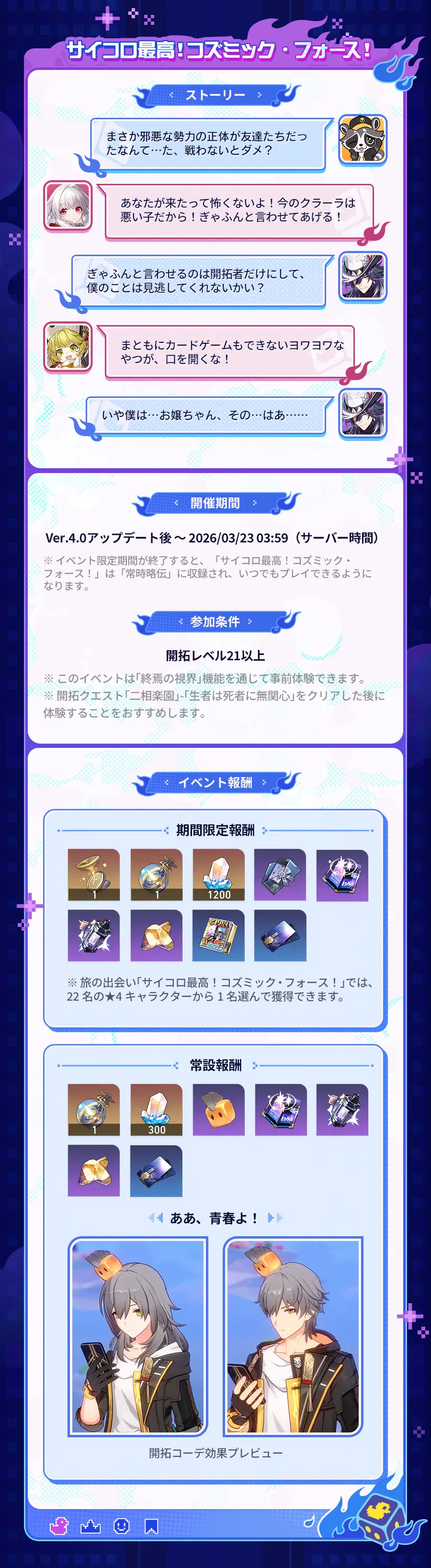 期間限定イベント「サイコロ最高!コズミック・フォース!」終了後、期間限定報酬は獲得できなくなりますが、マップ「鳩川区」にて「アオハル」と会話することで、コンテンツを体験したり、常設報酬を獲得したりすることができます。