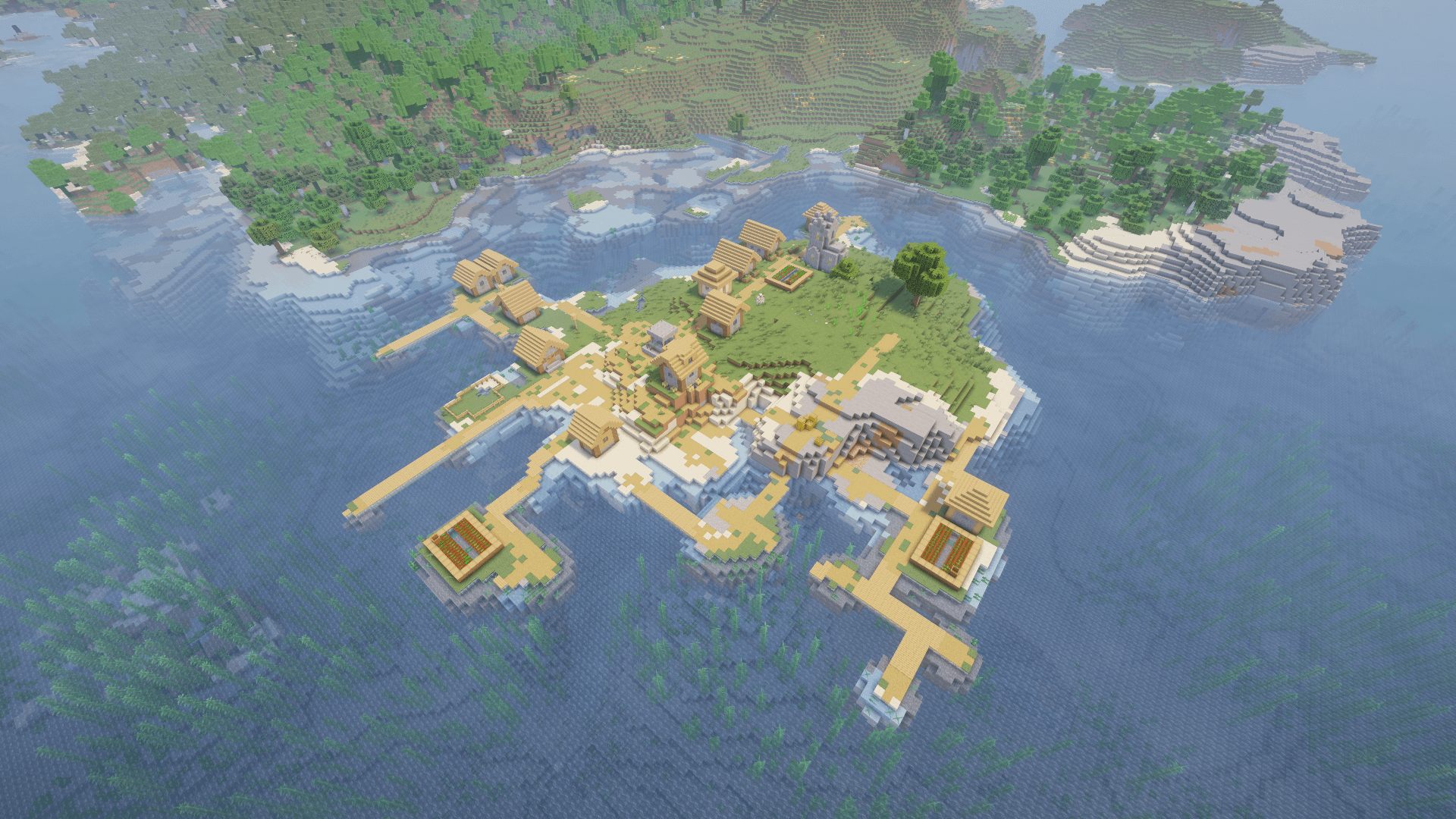 シード: 1641635786 から投稿された別の村のエントリ シード – 特に景色が良いわけではありませんが、頻繁に見られるものでもありません。メインのスポーン地のすぐ外に小さな独立した島があり、適度な大きさの村があります。 by VintageRice