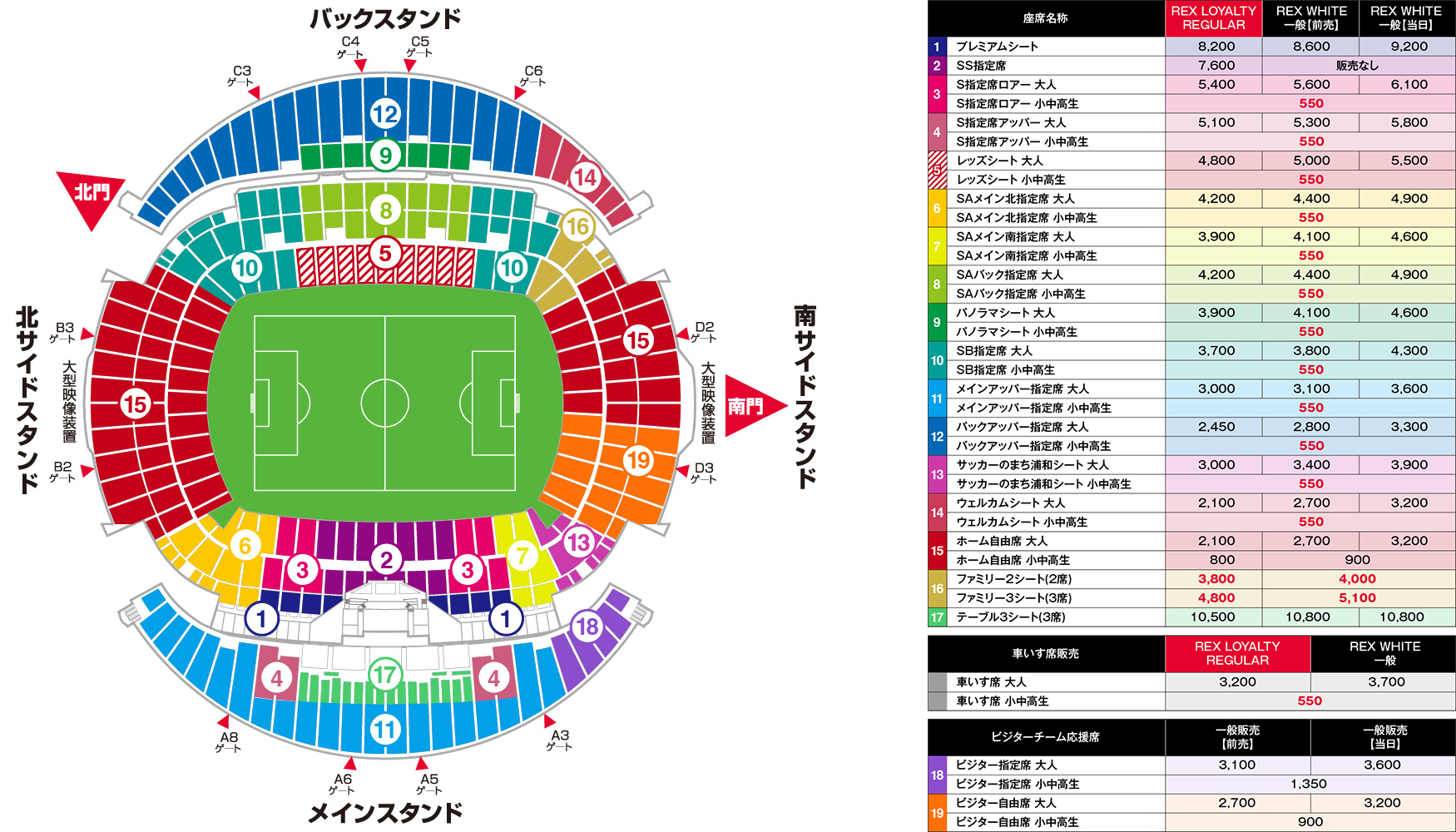 ♢「ホーム自由席」「プレミアムシート」「SS指定席」「S指定席ロアー(北側)」「レッズシート」「各SA指定席」「パノラマシート」「SB指定席」「バックアッパー指定席」「サッカーのまち浦和シート」「ウェルカムシート」「ファミリーシート」「ビール引換券付きシート」の座席は、対戦(ビジター)チームの「応援」および「応援グッズの着用、使用」はできません。また、ホーム自由席に、ビジター自由席チケットでの入場はできません。