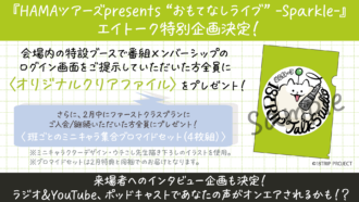 イベント特設ブース付近にて、3月10日・17日・24日・31日の放送の『HAMAツアーズpresents “おもてなしライブ” -Sparkle-』振り返り回でご紹介する感想を募集!ラジオ&ポッドキャスト&YouTubeにてあなたの声がオンエアされるかも?ぜひご参加ください。