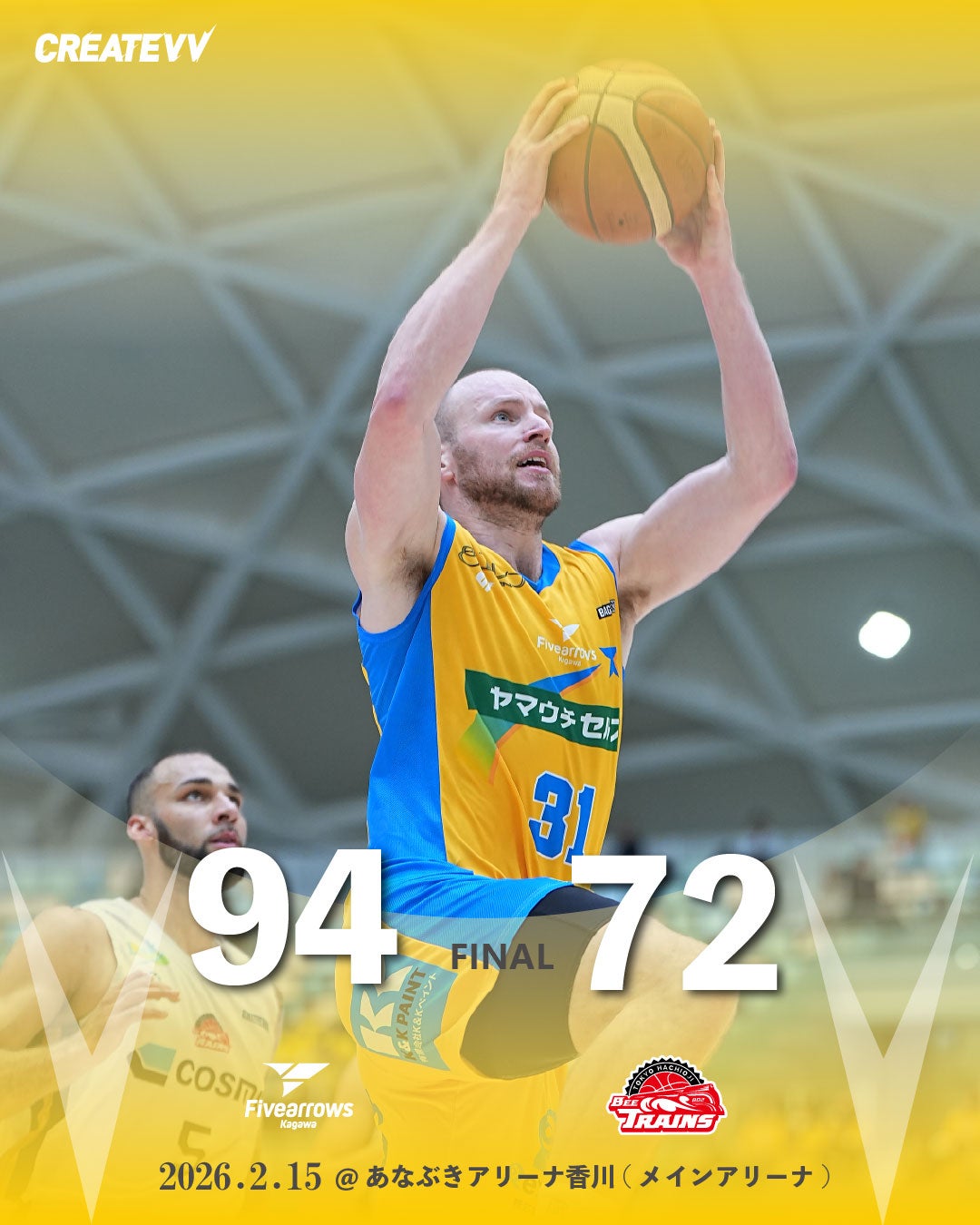 GAME REPORT B3 REGULARSEASON 2025-26 第20節【GAME2】 HOME ■日時:2026年2月15日(日) 13:00 TIP OFF ■会場:あなぶきアリーナ香川(メイン) 香川ファイブアローズ 94(23-32-22-17) 東京八王子ビートレインズ 72(13-18-18-23) BOX SCORE・PLAY BY PLAY 籔内幸樹HC コメント タッカー・ヘイモンド選手 コメント 今林萌選手 コメント