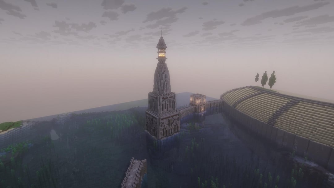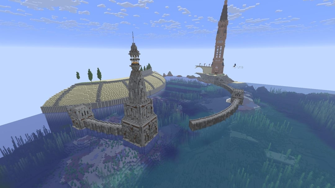 このローマ時代の港を再現しようとしています。私がオンラインで見た創作画像です。何か提案はありますか?具体的には灯台についてでしょうか?写真に似せつつも、細部と奥行きをうまく表現するのが難しいと感じています。ビルドに追加した木材が適切かどうかわかりません。