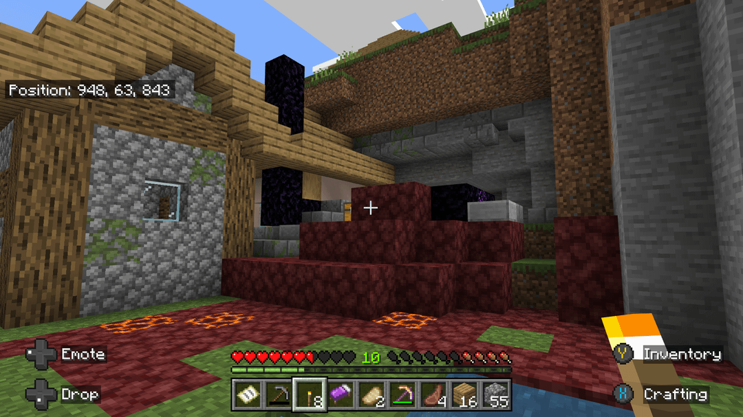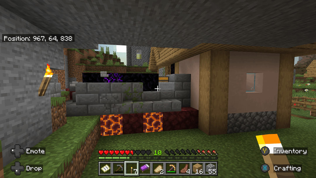 大きな村とその周囲に絡み合ったネザーポータルの遺跡。シード 6453698886