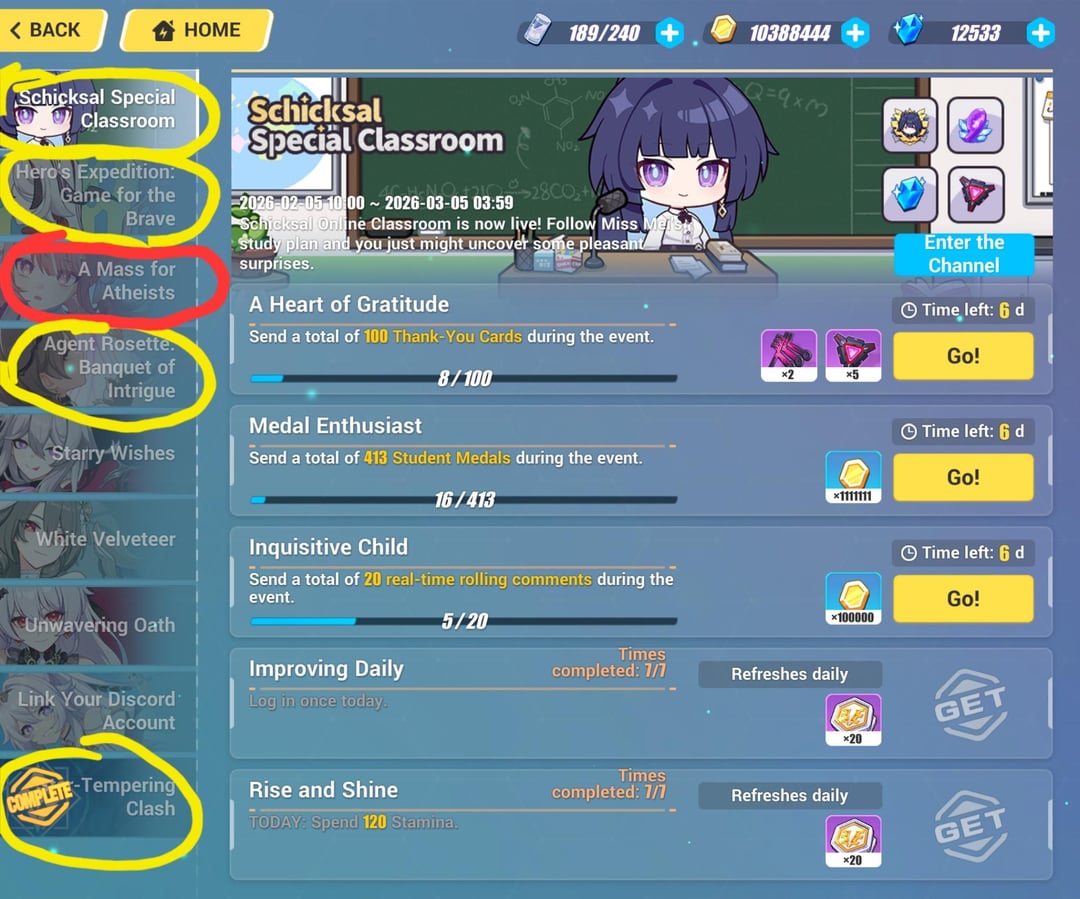 初めての方、または忘れてしまった方は、いくつかのイベントをプレイすることで Lunar Vow を入手できます。次のパッチでバフされるので、彼女にとっては良いアイデアです。 (こちらは初心者向けです) プレイできるイベントを黄色で囲みました。赤丸で囲ったものはプレイしないでください。それが現在のメインストーリーの章です。 by EndAny7916