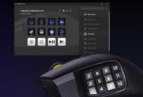 そして、CORSAIRでは、自社ブランドの製品でStream Deck対応を推し進めつつある。その1つが「SCIMITAR ELITE WIRELESS SE」。サイドに12個のボタンを備えたこのゲーミングマウスは、各ボタンにStream Deckの機能を割り当てることができる。もちろんVirtual Stream Deckと併用して、画面上のボタンを押すのにも使える。