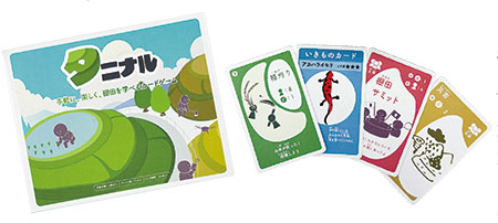 「作業」「いきもの」「アクション」「イベント」の4種類で構成。カードに書かれた草刈りや石取り、水入れなどを順に実行し、稲刈りまで完了すると、耕作放棄地が再生する道のりを学べる。2〜4人の対戦にも、全員で挑む協力形式にも対応。カードやパッケージデザインは、一目で意味が伝わる絵文字を採用するなど工夫した。
