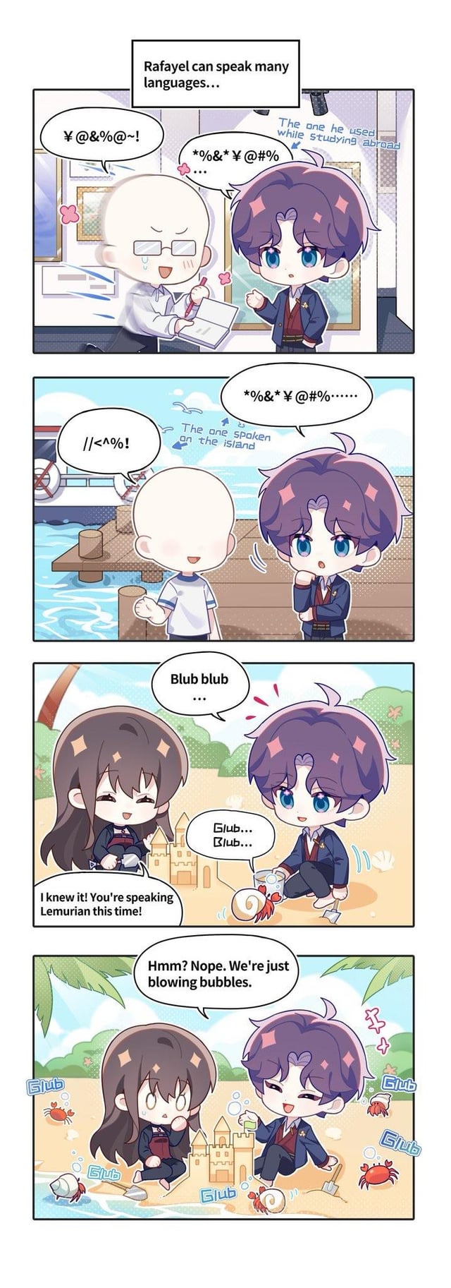 見てください、彼は小さなカニとおしゃべりしています。彼は何語を使っていると思いますか?