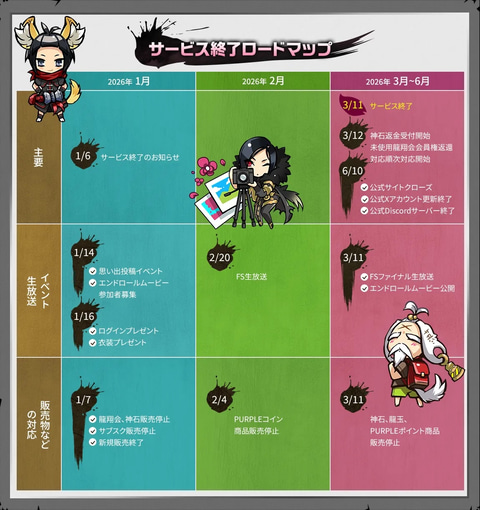 3月2日には有償通貨「ネコの実」によるアイテム購入、ガチャ、召喚機能が停止するが、最後までユーザーが楽しめるよう、ゲーム内イベントなどは継続して実施される。