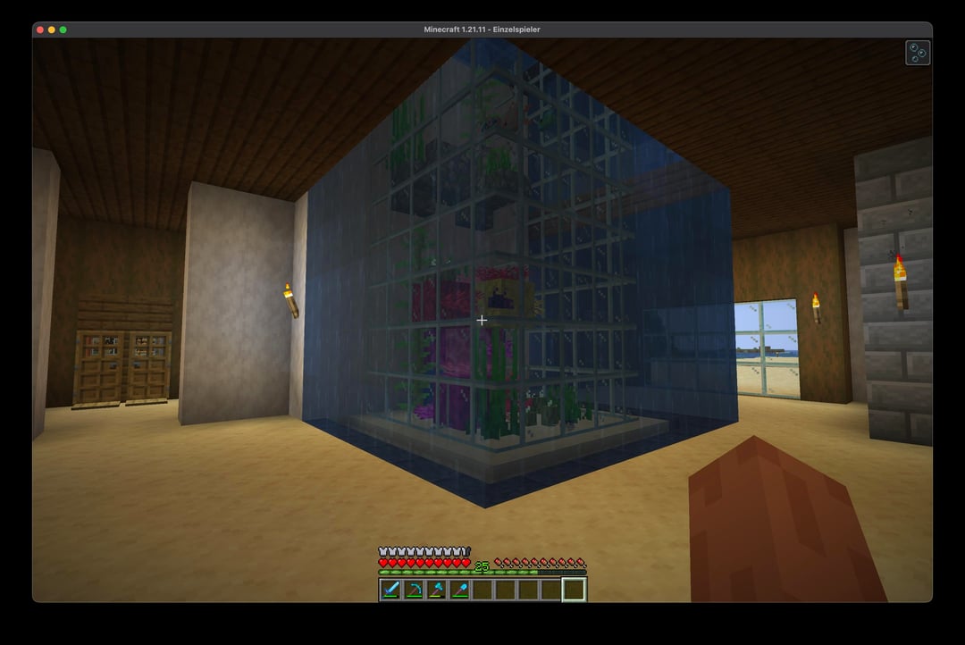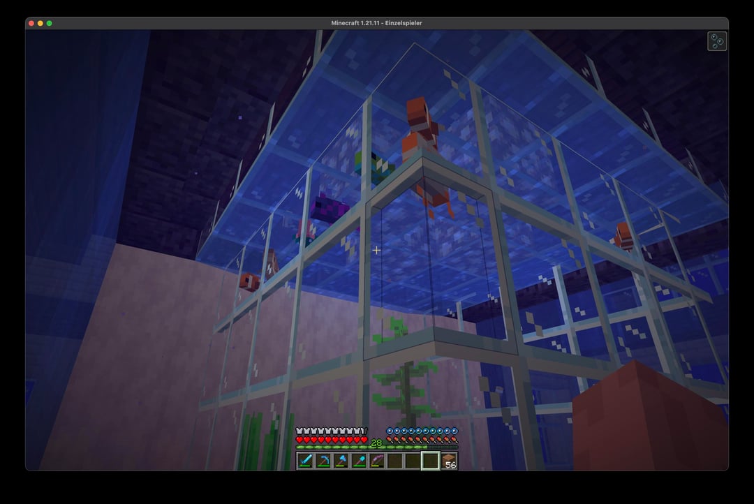 初めてのサバイバルワールドです。大きな水槽に必要なすべてのリソースを集めるのに時間がかかりました。しかし、終わってみるとかなりがっかりしました。とても濁っていて暗いようです。そしてすべての魚は左上にあります。電流が流れていないことを確認しましたが。水槽を改善するために何かできることはありますか? by Paratrooper2000
