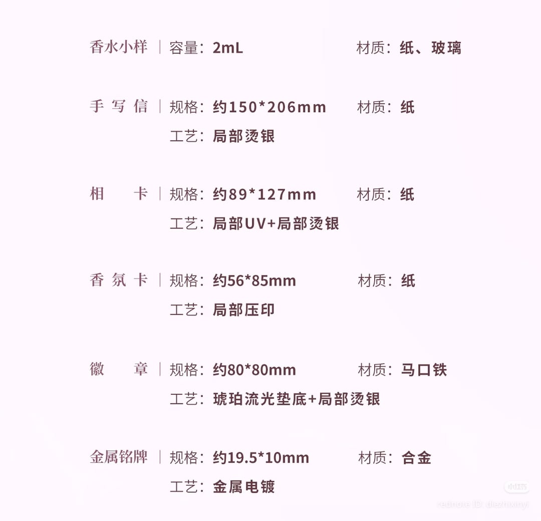 50mlプレゼント:香水サンプル、直筆レター、フォトカード、フレグランスカード、缶バッジ、メタルネームプレート
