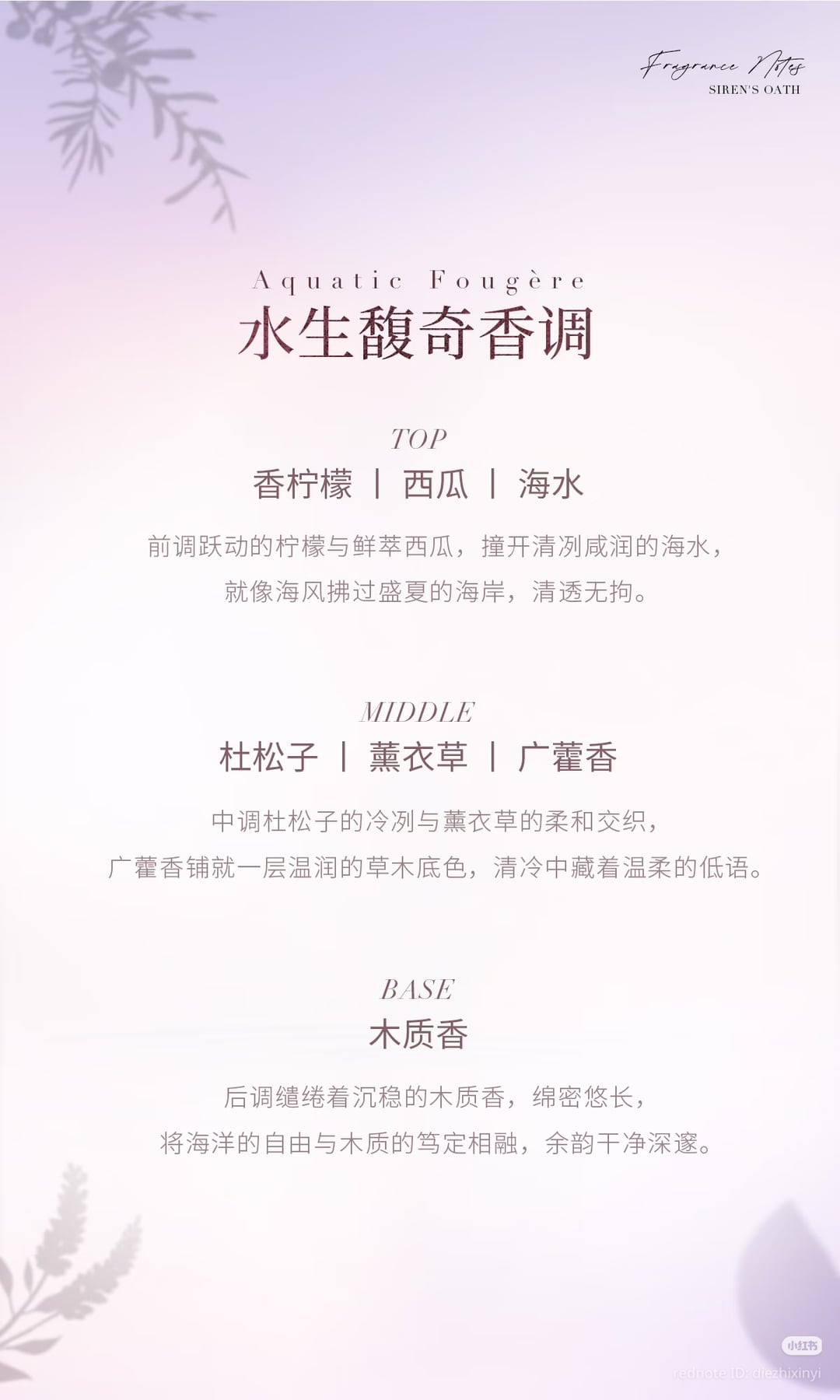ミドルノートは**ジュニパー**の涼しさと**ラベンダー**の柔らかさが絡み合い、**パチョリ**は暖かみのあるウッディのアンダートーンを築き、冷たさの中に優しいささやきを隠します。