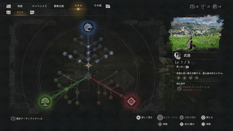 クリフのスキルツリー画面。「アーティファクト」と呼ばれるアイテムを消費し、スキルを強化していく