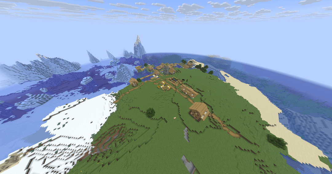 スポーンは放棄された村の隣の小さな島にあり、その村の下には村の近くの廃坑があり、廃墟となったネザーポータルもあり、村の近くにはトレイルチャンバーがあり、氷のバイオームもあります。