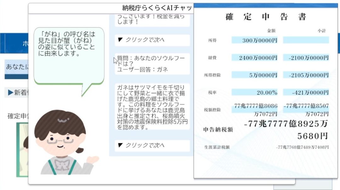 怪しいAIに「確定申告」を任せるゲーム『納税庁らくらくAIチャット』無料公開。“きのこの山好きには山林所得上乗せ”など、トンデモ理論炸裂ゲーム【リリース済】