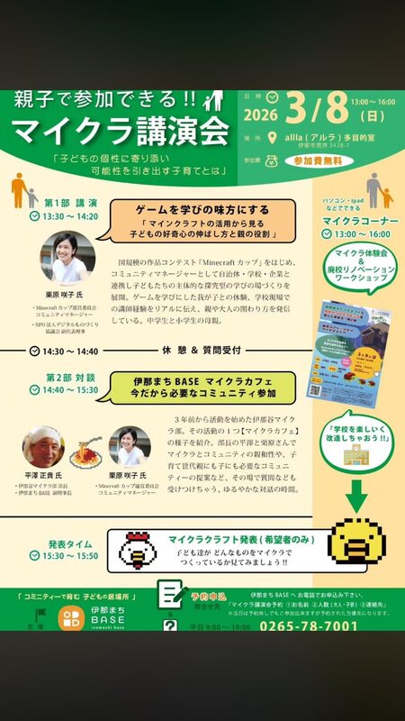 伊那市アルラで開催されたマイクラ講演会に参加しました。講師は栗原咲子さん(Minecraftカップ実行委員会)でした。4年前の伊那市図書館イベントからの再会。