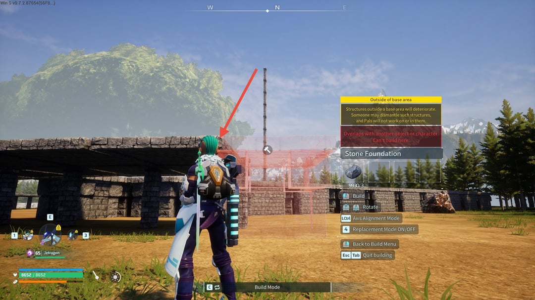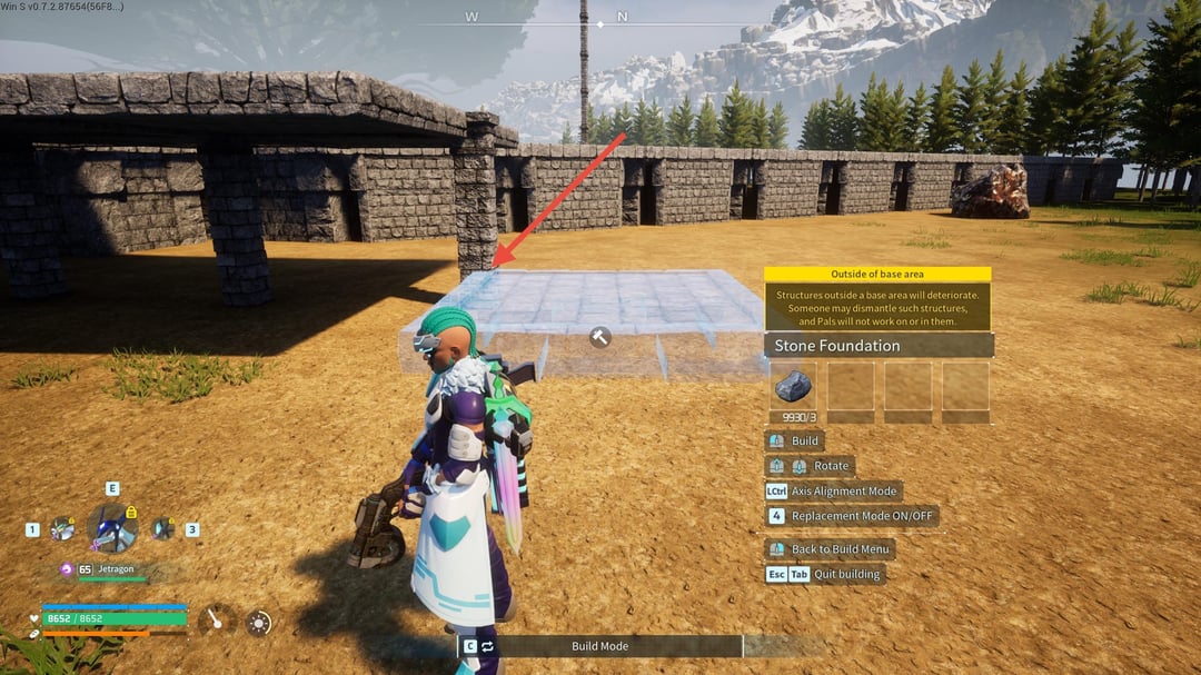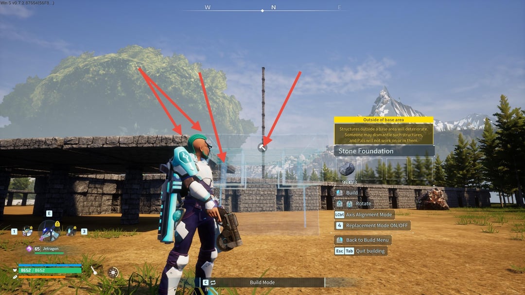 次に、基礎部分を 1 つずつ柱の途中までクリップします (写真 17 を参照)。隣の屋根の高さまで上に伸ばし、奥行き方向にも並んでいることを確認します (写真 18 を参照)。次に、ビルド カーソルを中央の柱に合わせ、配置できるように青く点灯するまで基礎をゆっくりと調整し、適切に配置できるように高さと深さを再確認します。必要に応じて微調整を行って配置します (写真 19 を参照)。最初の試みで完璧な配置になることはほとんどありませんでした。そのため、この間にかなりの量の破壊/再構築が行われる可能性があります。各参考画像には、各ステップで何を探しているのかを示すために赤い矢印が含まれています。