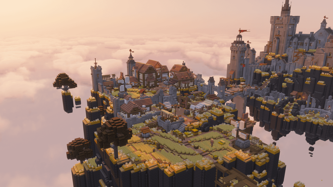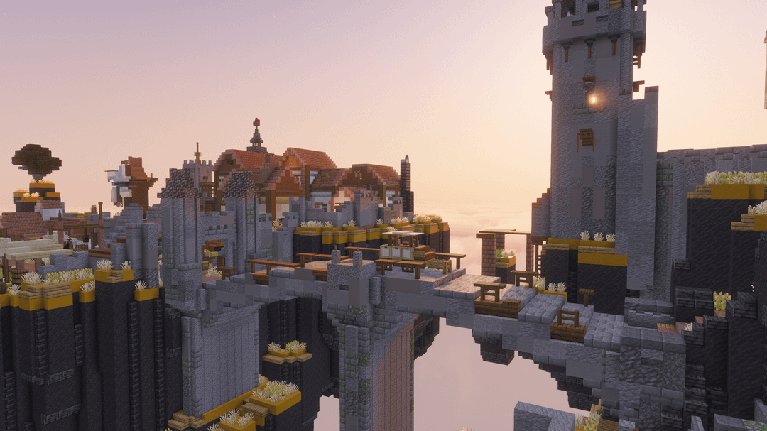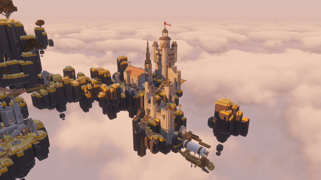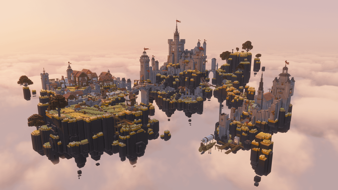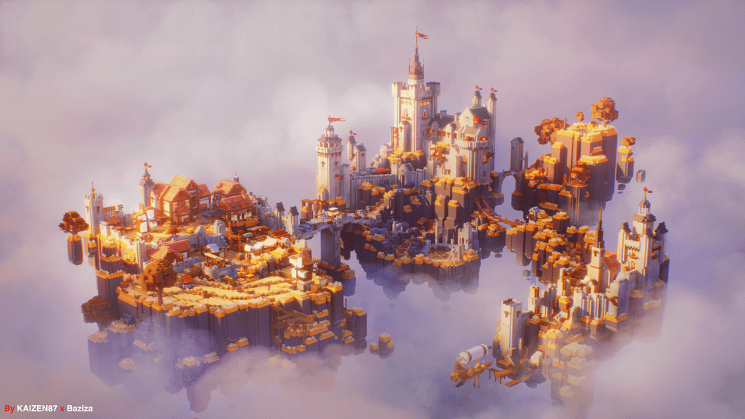 しばらく取り組んできたプロジェクト。浮島、城、小麦畑、中世の市場、飛行船のドック – すべては霧の上の橋とアーチで結ばれています。 KAIZEN87 x Baziza によって構築されました。 by Kaizens87