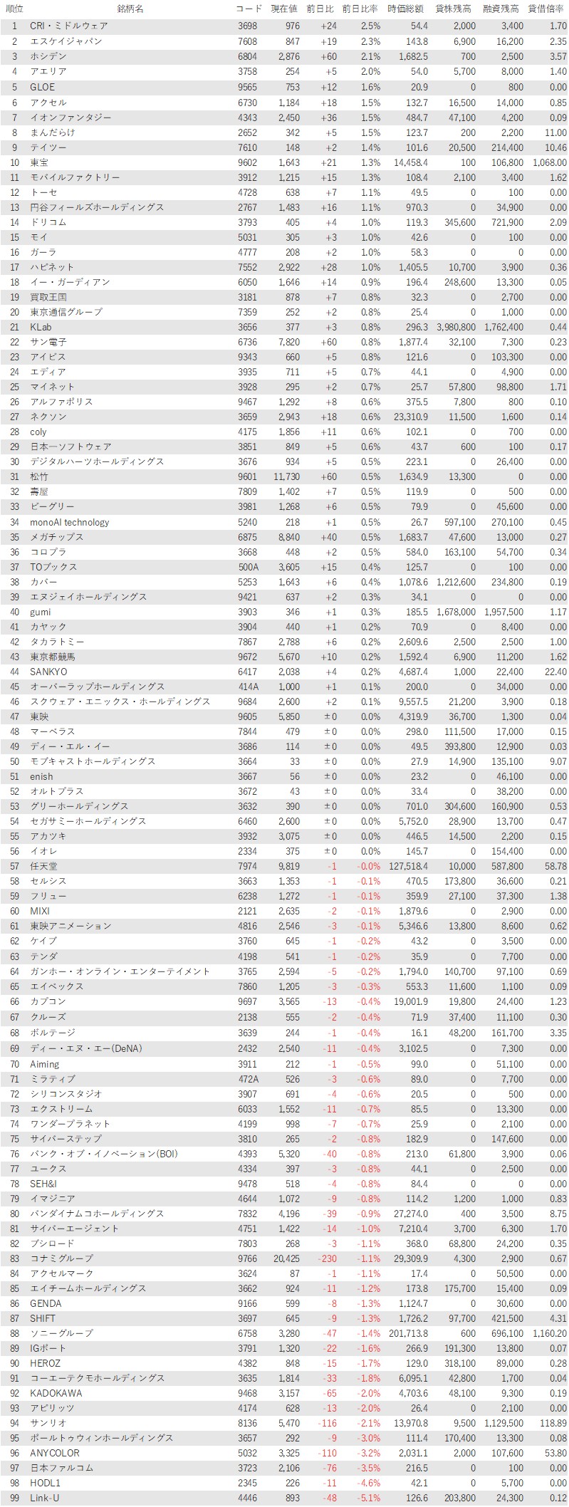 こうしたなか、ゲーム・エンタメ関連企業をみると、登録されている99銘柄のうち、上昇は46銘柄(46%)、下落は43銘柄(43%)、変わらずは10銘柄(10%)で、やや買い優勢だった。主力市場が活況を呈すなか、この日は再びコンテンツ関連に資金が入りづらい状況になっているかもしれない。