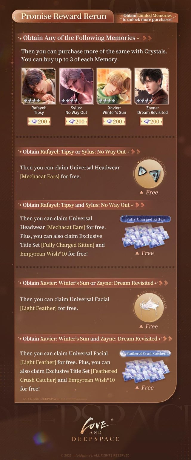 [Rafayel: Tipsy]、 [Sylus: No Way Out]、 [Xavier: Winter's Sun]、 そして [Zayne: Dream Revisited]。