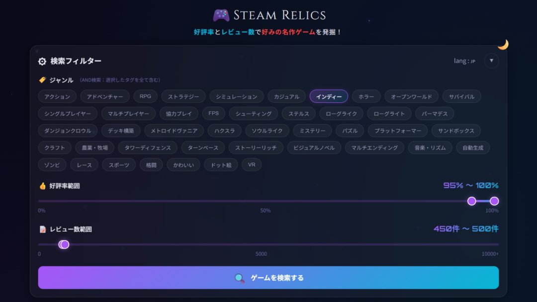 「Steam Relics」は、Steamで配信されているゲームを簡単に探せるサービスとなっている。サイトにアクセスすると、画面にはジャンルなどを絞り込める検索フィルターが表示される。まずは検索したいゲームのジャンルを1つ以上選択し、好評率やレビュー数の範囲をスライダーで設定。あとは検索ボタンを押すだけで、該当するゲームを一覧表示可能だ。各カードには、マルチプレイ対応の有無や体験版の存在、コントローラーへの対応などの情報もアイコンで表示される。