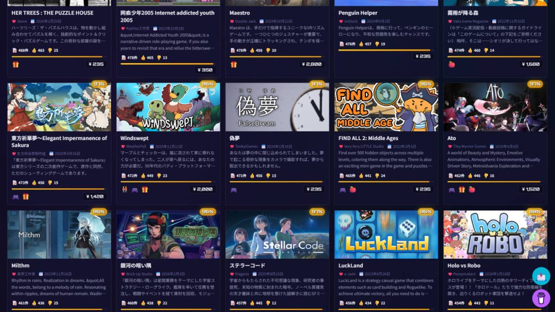 では試しにこのサービスを実際に利用してみる。たとえば、好評率95%以上でレビュー数は450~500件、すなわち「圧倒的に好評」ステータスにまもなく到達しそうなインディーゲームで絞りこんでみると、日本語対応のゲームは21件ヒットした。ここには、SFミステリーアドベンチャー『ステラーコード』や異変発見ゲーム『偽夢』、ペンギン救助ゲーム『Penguin Helper』などが含まれることがわかる。このように、隠れた名作を発掘するのに便利なサービスというわけだ。