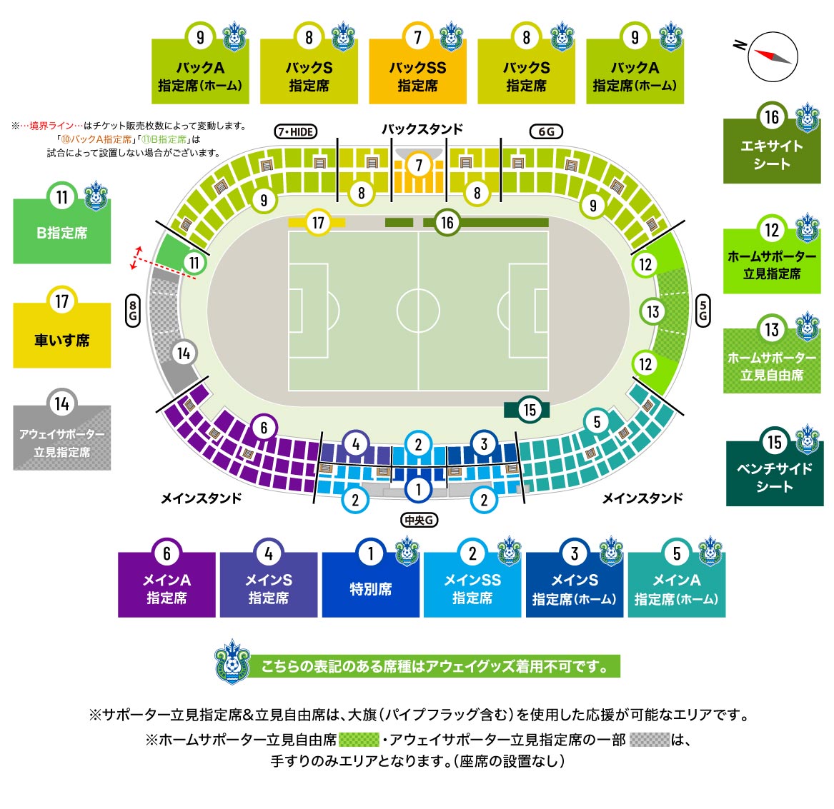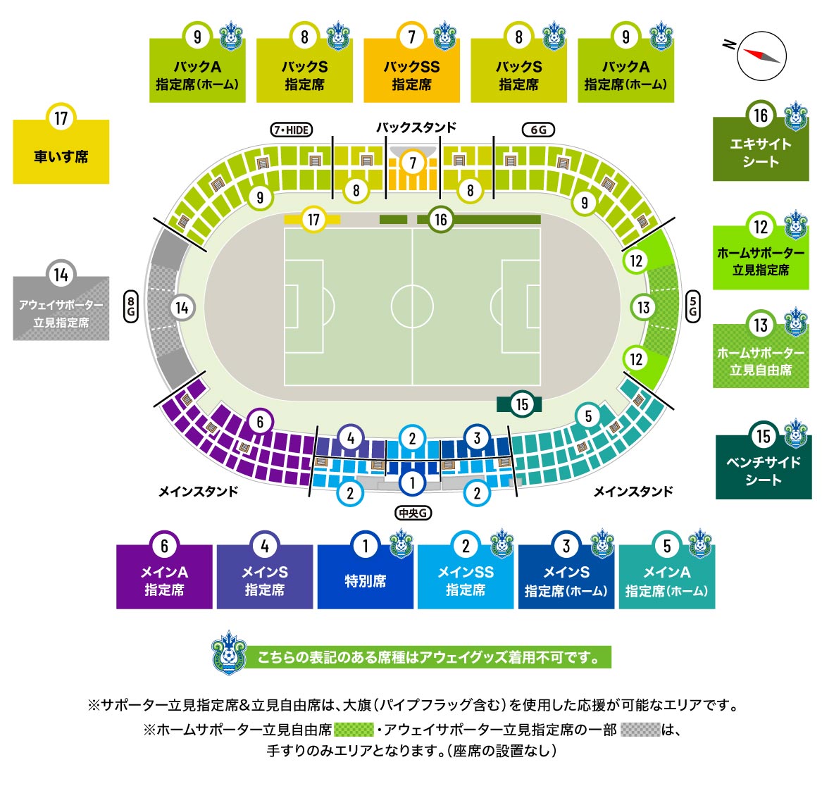 席割図上に湘南ベルマーレクラブエンブレムの表記がある席種は、アウェイグッズの着用ができないエリアとなります。