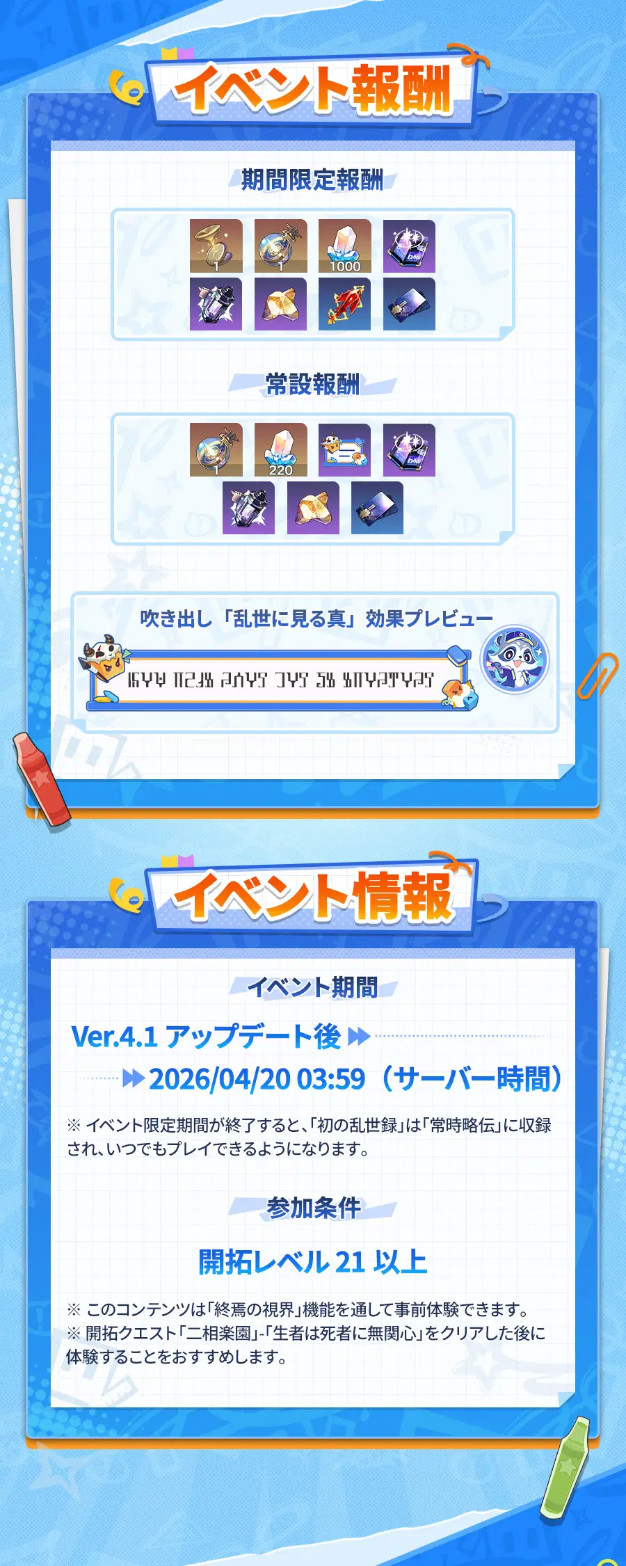 期間限定イベント「初の乱世録」終了後、期間限定報酬は獲得できなくなりますが、マップ「グラフィエ学院」にて「誑二」と会話することで、コンテンツを体験して、常設報酬を獲得できます。