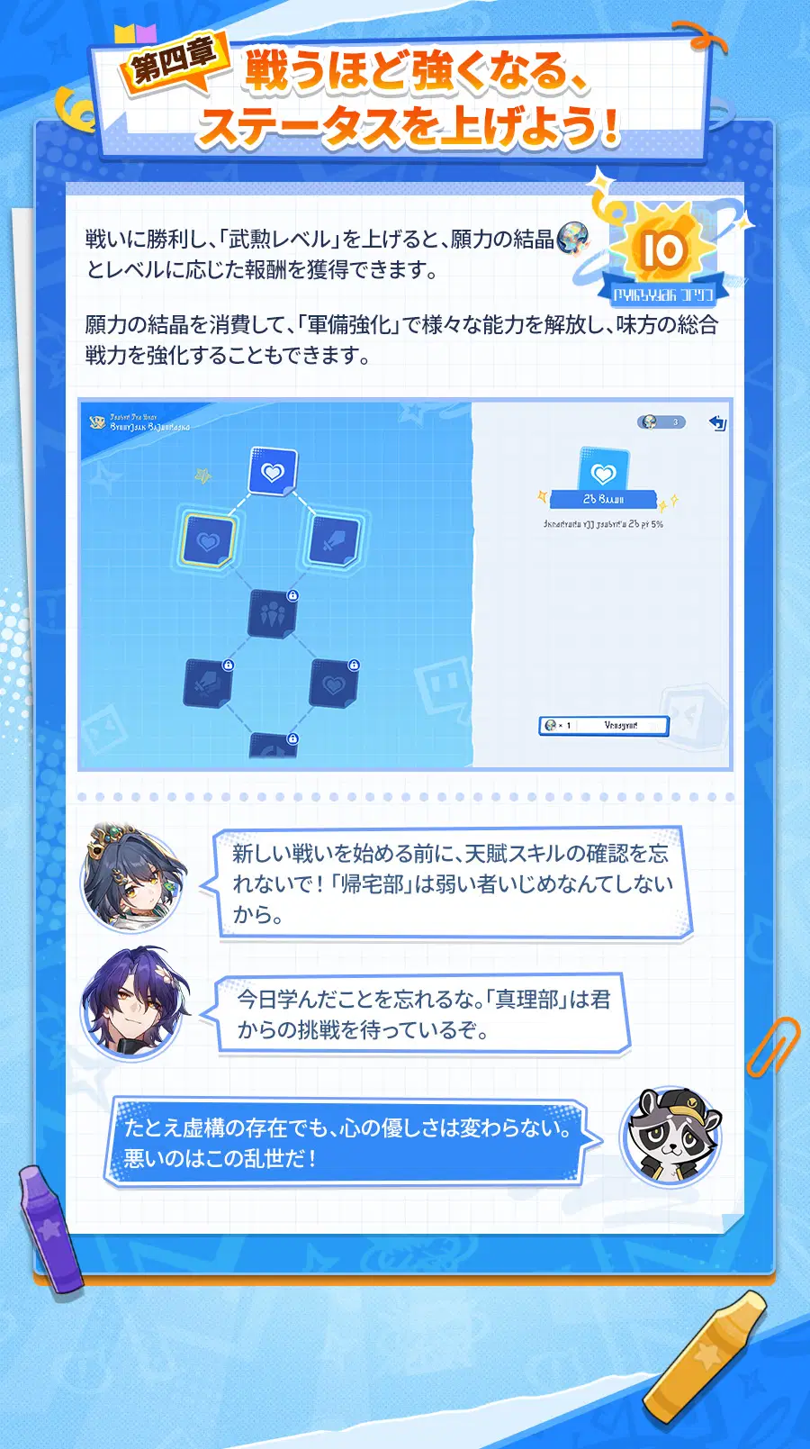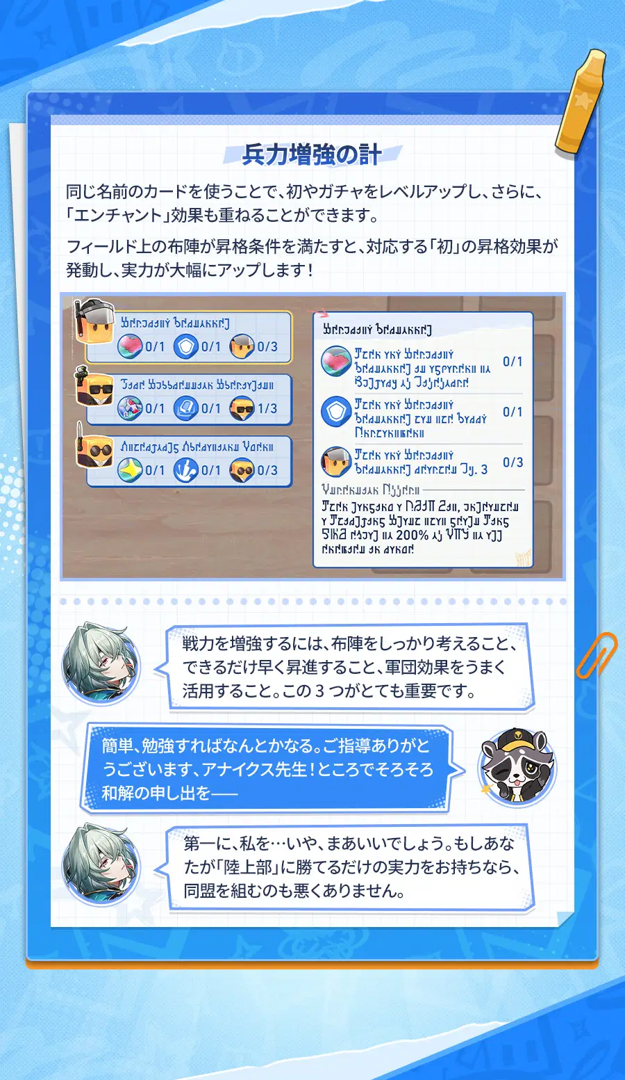 戦いをクリアするたび、新たな初軍団が解放されます。「軍備強化」で「願力の結晶」を使用して軍団を強化することもできます。