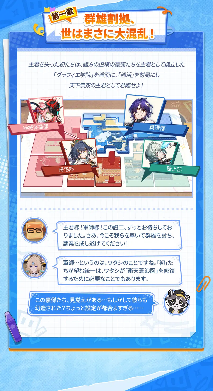 「初の乱世録」では、開拓者は初軍団を率いてグラフィエ学院で戦いを繰り広げます。学院にはそれぞれ縄張りを持った4人のボスがいて、開拓者の挑戦を待っています。