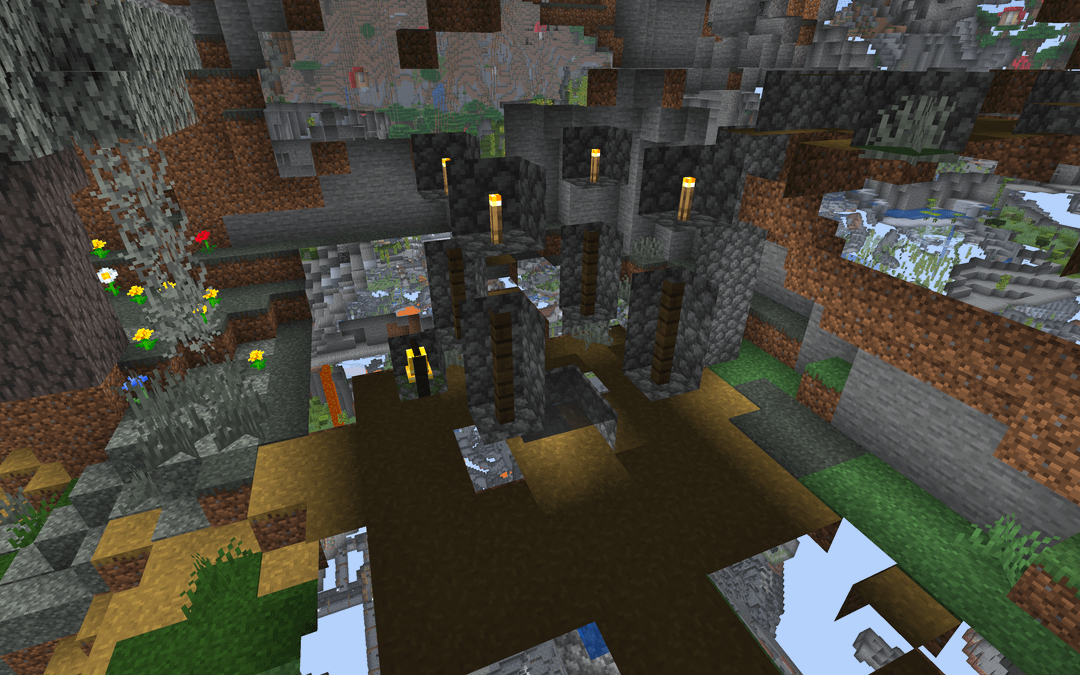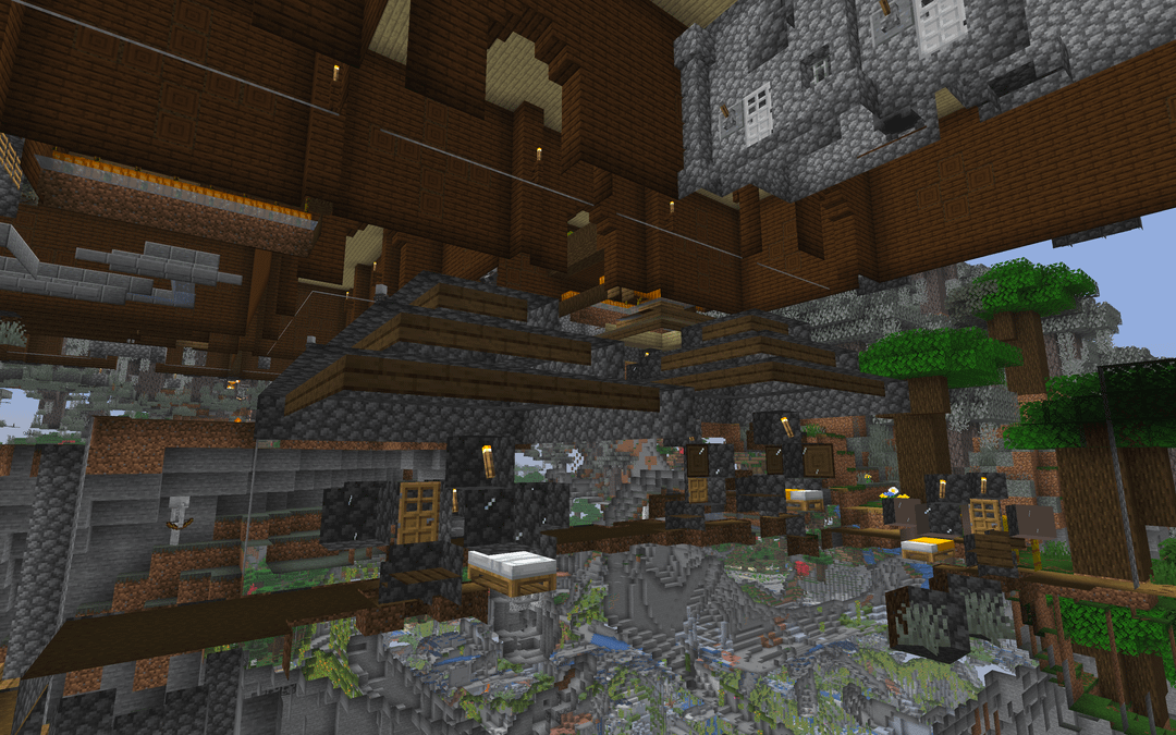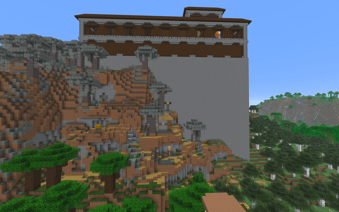 森の屋敷(のようなもの)の中に生成された村。シードは 7073245350281013044 (Java 1.21.11)、-1919, 150, 1424 にあります。