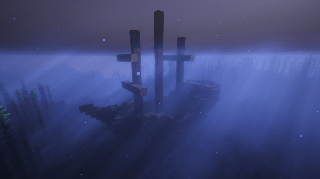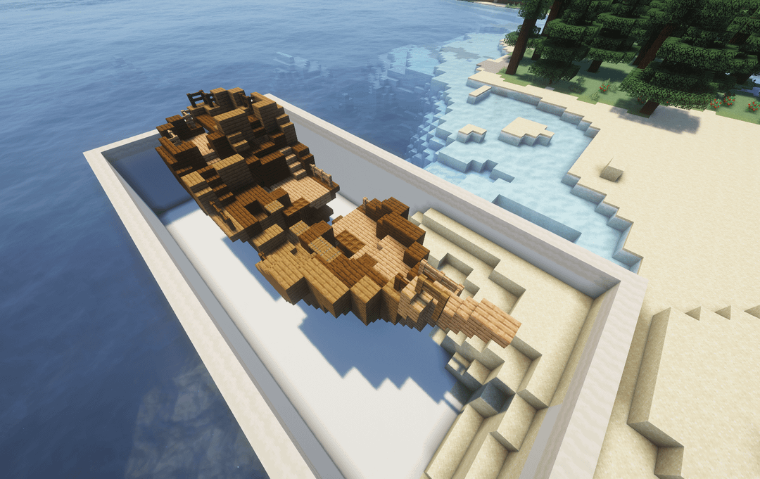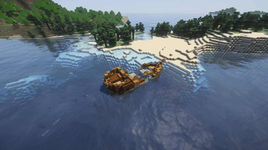 およそスポーン付近 -900、-200 水面下に完全な難破船が見えるでしょう
