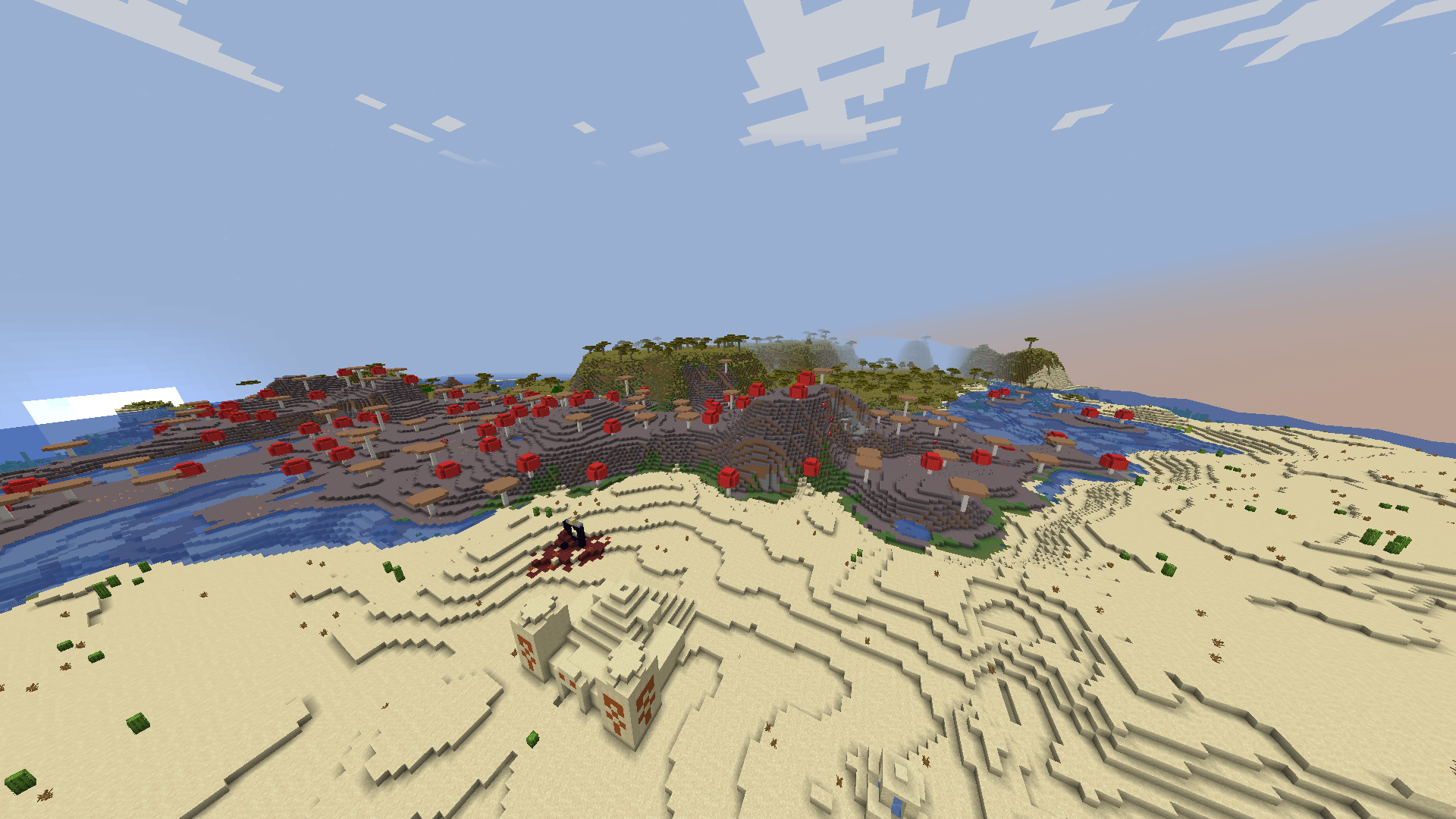 砂漠とサバンナバイオームの間にある陸上のムーシュルームバイオームにおける興味深い一連の出来事 座標: -12602 4858 シード: -6836818213838454887 バージョン1.16.1 by Spchlorgendy