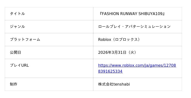 今般、世界中で人気を集めるオンラインゲームプラットフォーム「Roblox(ロブロックス)」にて、ゲーム内に再現したSHIBUYA109渋谷店でファッションコーディネートバトルが楽しめるオリジナルゲーム『FASHION RUNWAY SHIBUYA109』 を2026年3月31日(火)にリリースいたしました。