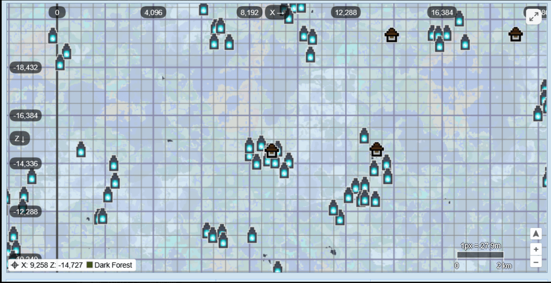 スライド 2: X: 9k、Z: -14k 付近に邸宅がある 7 つの古代都市クラスター。