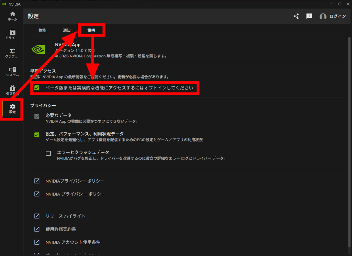 なお、NVIDIAアプリのベータ版を使用するには「設定」タブの「説明」より「ベータ版または実験的な機能にアクセスするにはオプトインしてください」にチェックすればOKです。