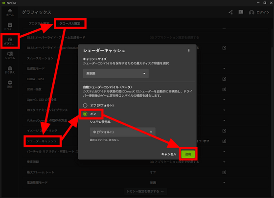 自動シェーダーコンパイル機能を有効化するにはNVIDIAアプリのグラフィックスタブにある「グローバル設定」の「シェーダーキャッシュ」において「自動シェーダーコンパイル」を「オン」にすればOK。ただし、GeForce Game Ready Driver 595.97 WHQL以降のバージョンをインストールしておく必要があるとのこと。