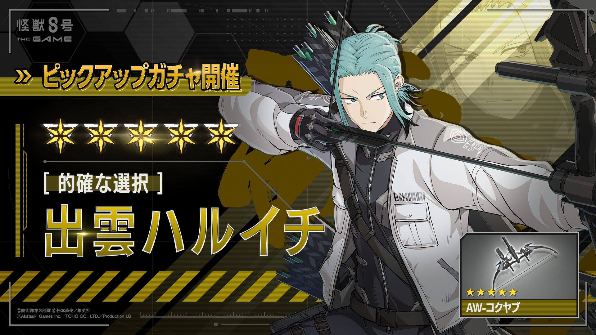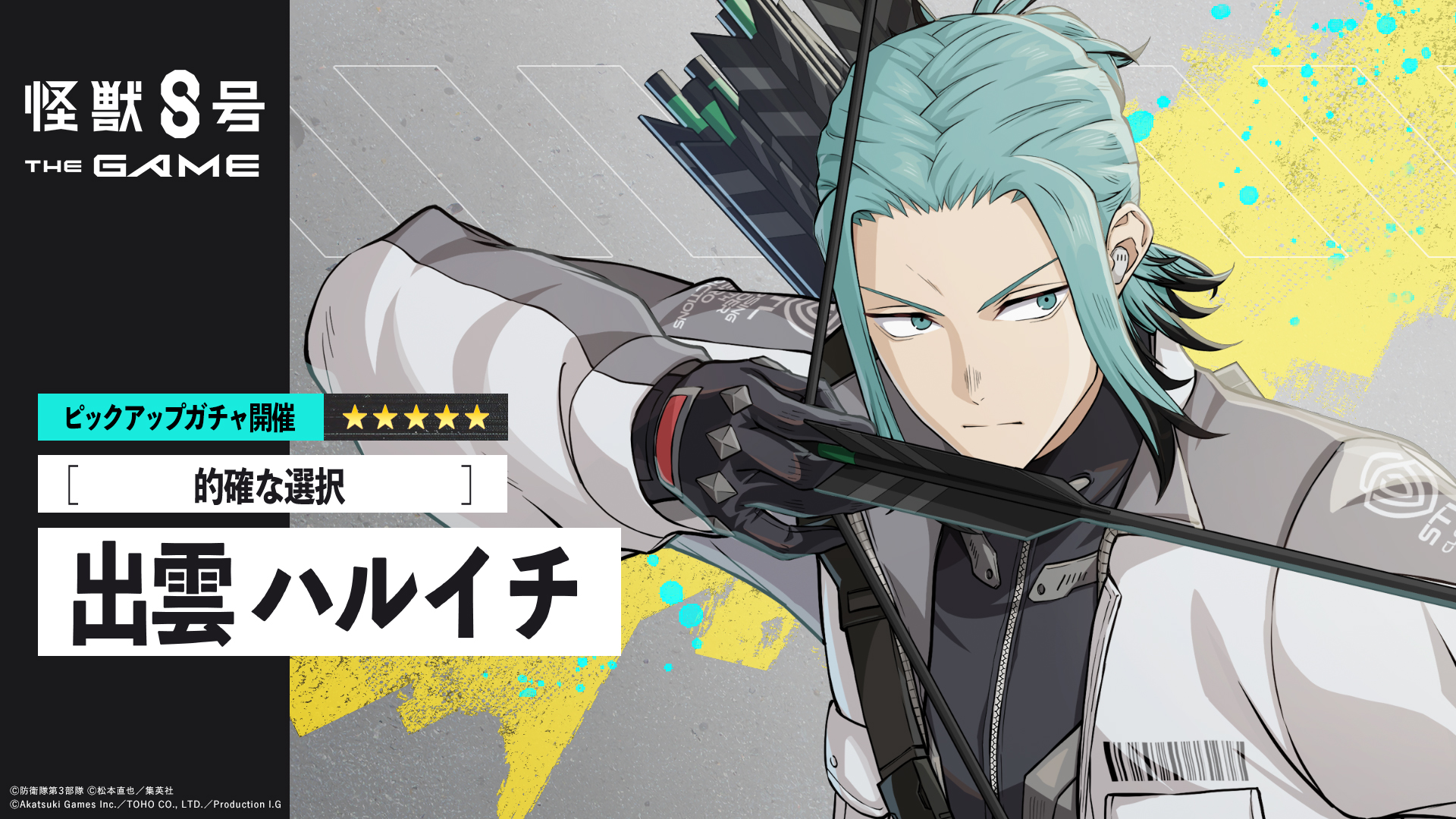 株式会社アカツキゲームス(本社:東京都品川区、代表取締役:戸塚 佑貴、株式会社アカツキ100%子会社)は、東宝株式会社(本社:東京都千代田区、代表取締役社長:松岡 宏泰)、株式会社プロダクション・アイジー(本社:東京都武蔵野市、代表取締役社長:和田 丈嗣)との共同プロジェクト『怪獣8号 THE GAME』において、メインストーリー10章の公開と新★5キャラクター[的確な選択]出雲ハルイチの実装をお知らせいたします。