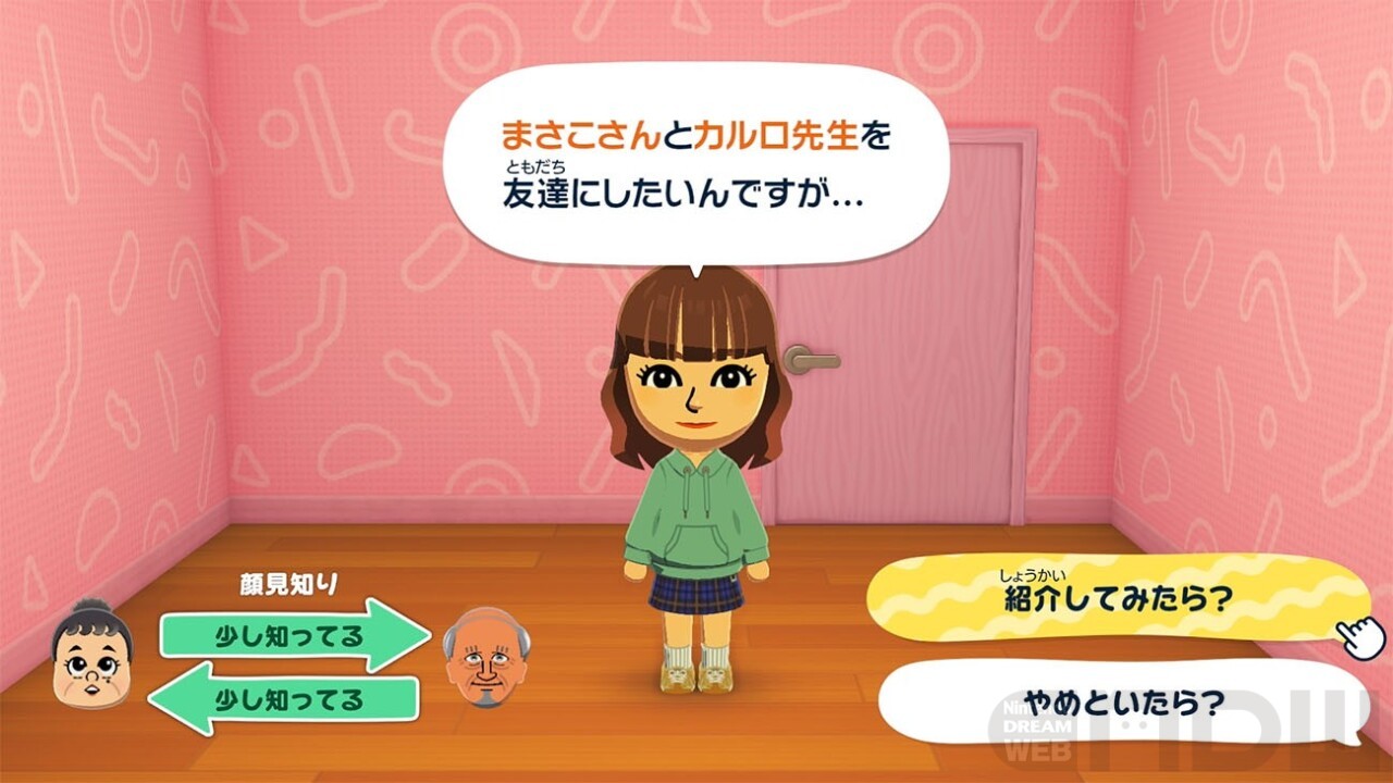 また、住人をつまんで別の住人のところへ持っていけば、ふたりが仲良くなるきっかけを作ることもできます。積極的に関わる? 静かに観察する? 自分なりの距離感でMiiたちの関係を見守ってみてください。