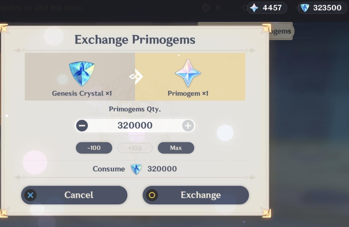 私は、 "マックス" ボタンを押すと、1 回のインスタンスでプリモジェムに変換できるジェネシス クリスタルの最大値は 320,000 個です (合計 323,500 個あることがわかります)。