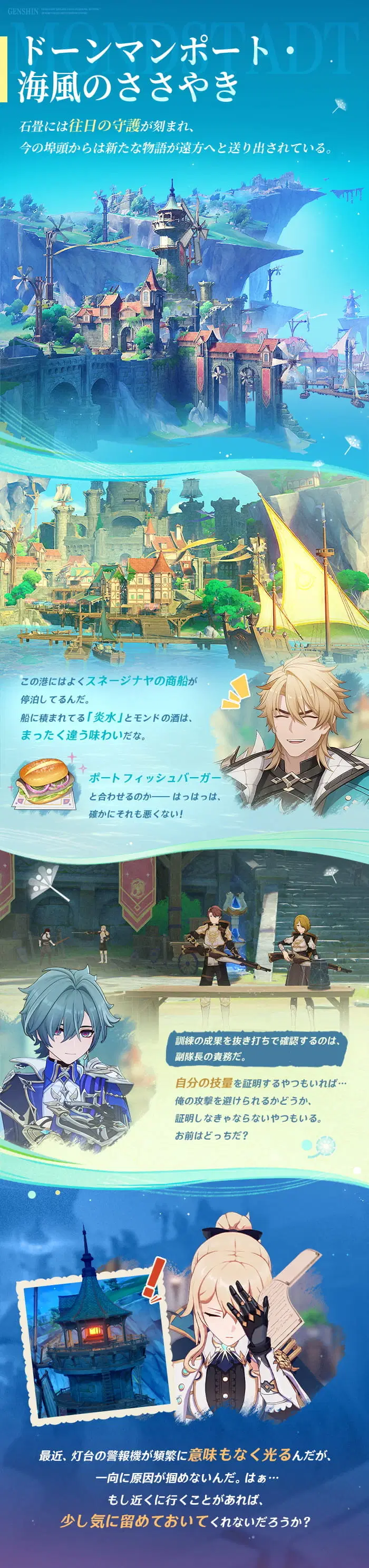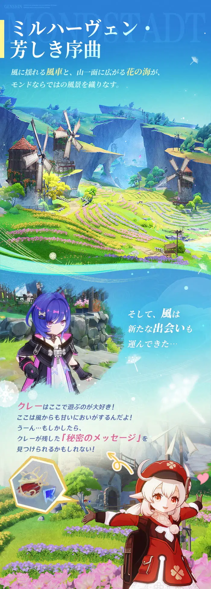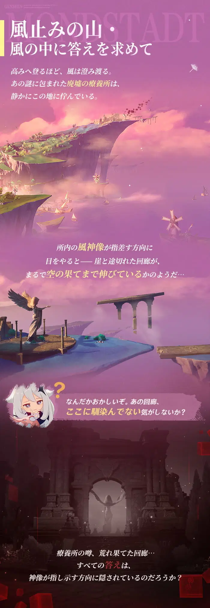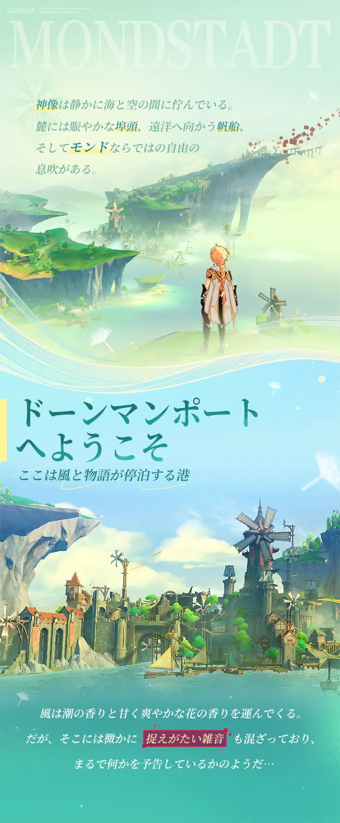 モンドの物語は続き、風が新たな旅への招待状を運んできました。ミルハーヴェンの花の香り、ドーンマンポートの潮風、そして幽霊が出ると噂される廃墟の療養所… 旅人さん、新たな物語が始まろうとしています。一緒にモンドの北部へ行ってみましょう!