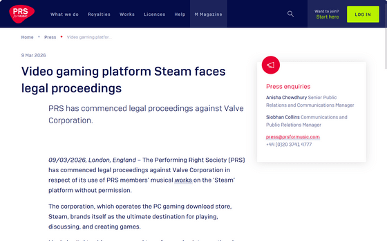 ゲーム配信プラットフォームのSteamを運営するValveが、イギリスの著作権管理団体であるPRS(Performing Right Society)から訴えられました。PRSは、Valveがゲームを配信することはゲーム内音楽を無許可で配信することにもなると訴えています。