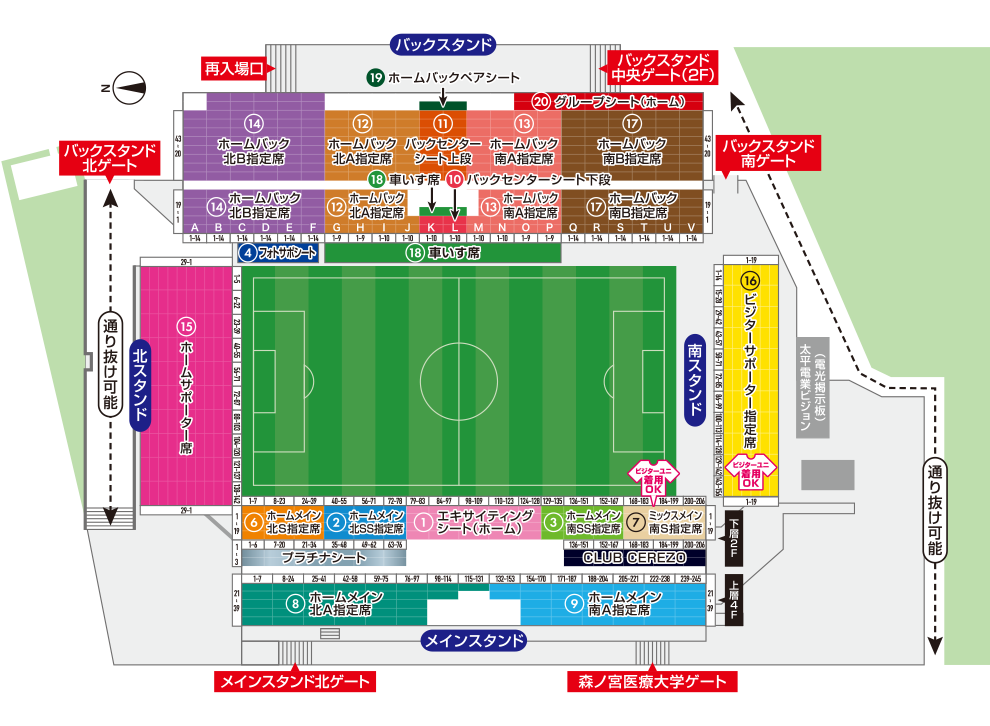 ※ビジターチームの応援をされる場合は、⑦ミックスメイン南S指定席、⑯ビジターサポーター指定席をお求めください