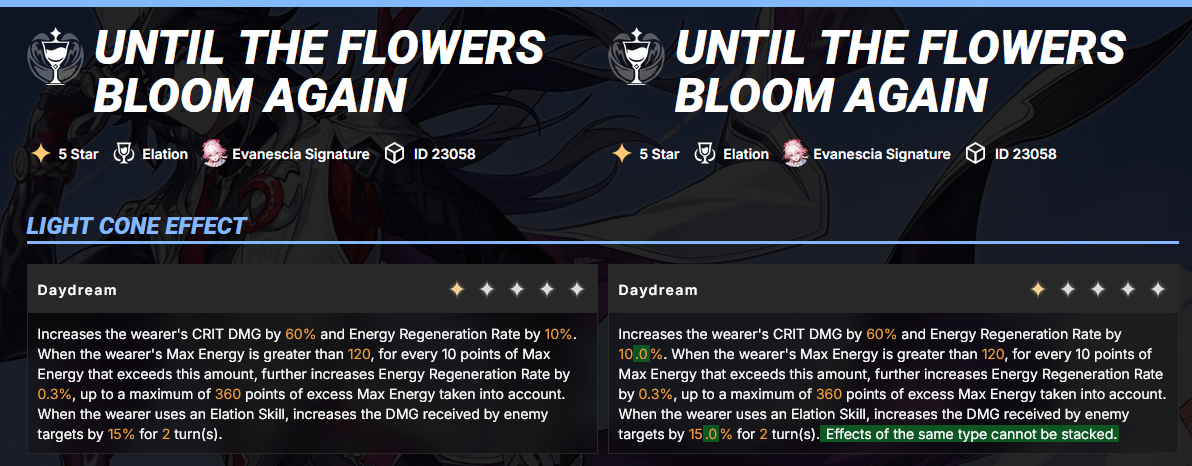 閲覧場所: https://hsr.gachabase.net/diff/lightcones/23058/until-the-flowers-bloom-again?prev=beta_4.1.53_14536466&cur=beta_4.1.54_14611439&lang=ja by Gachabase