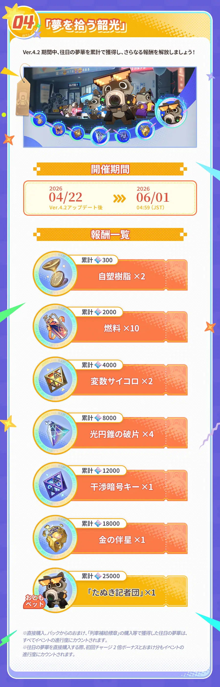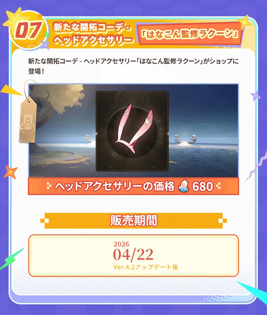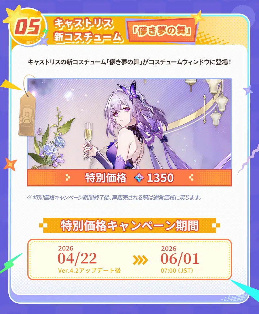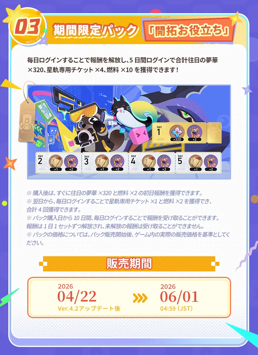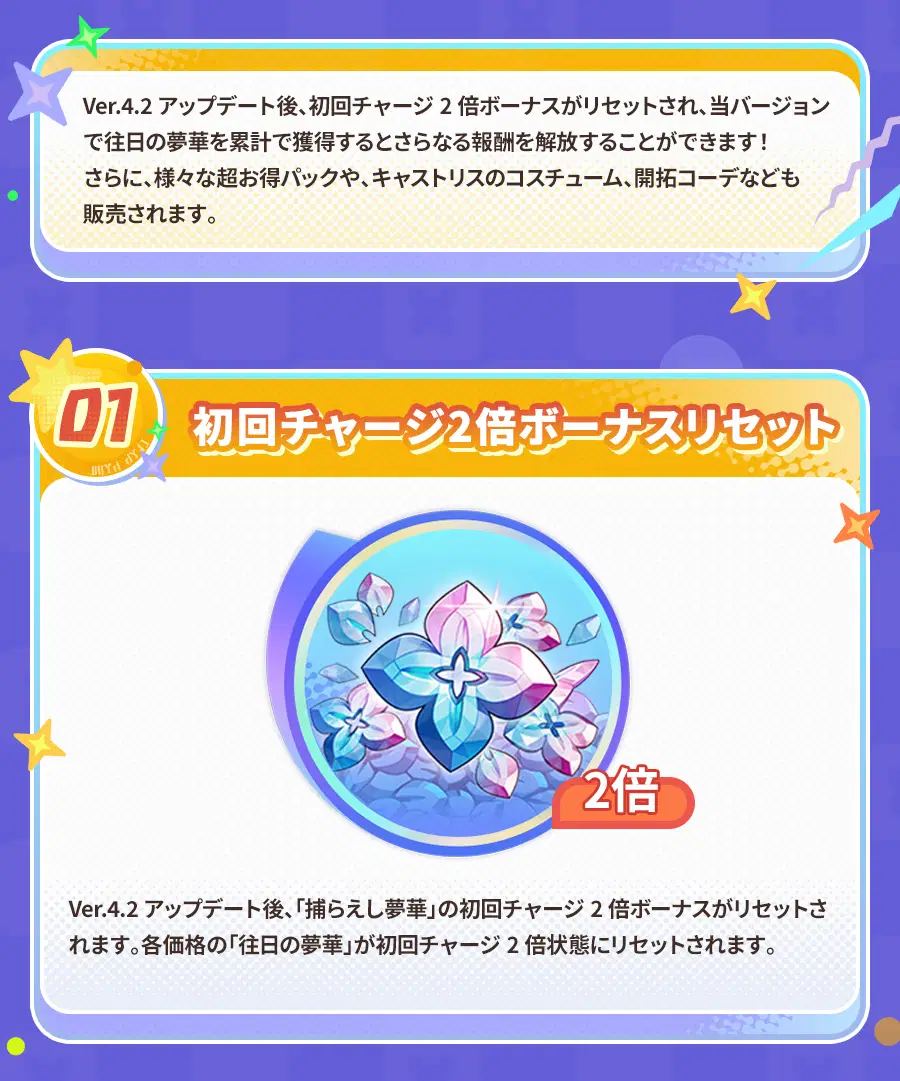 Ver.4.2アップデート後、初回チャージ2倍ボーナスがリセットされ、当バージョンで往日の夢華を累計で獲得するとさらなる報酬を解放することができます! さらに、様々な超お得パックや、キャストリスのコスチューム、開拓コーデなども販売されます。