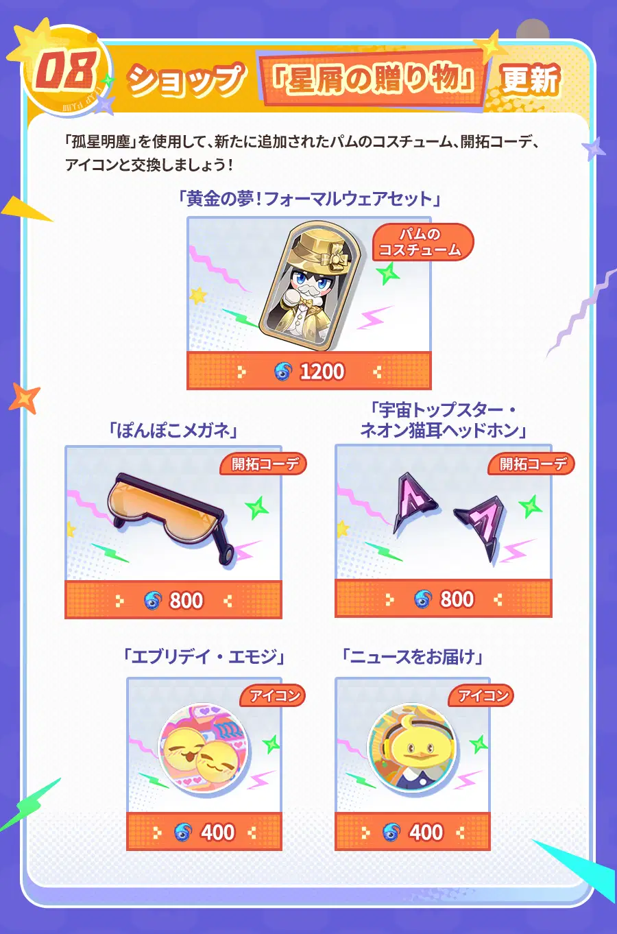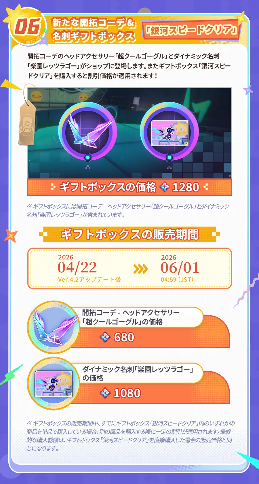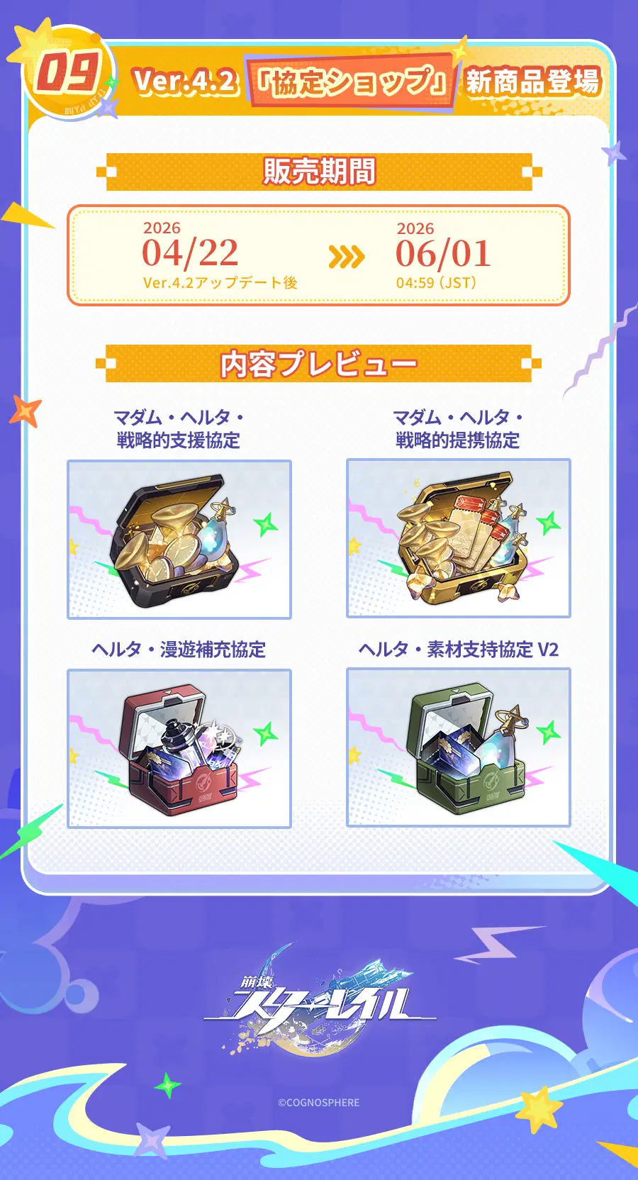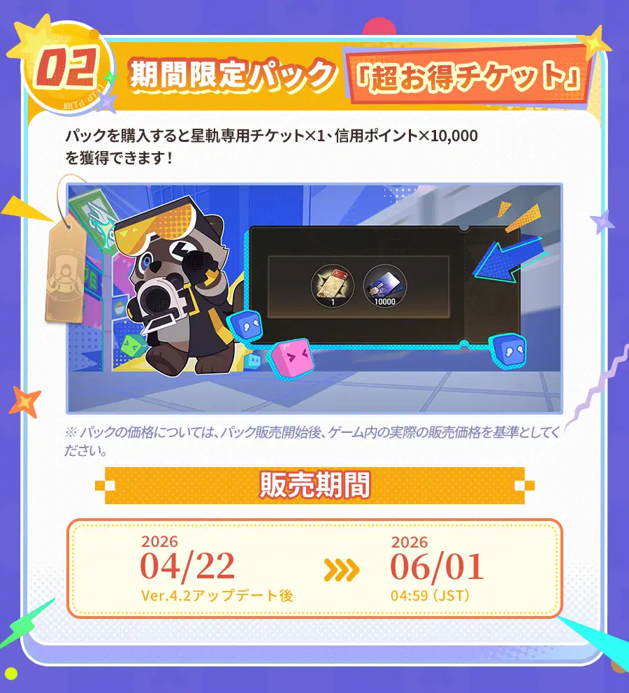 Ver.4.2アップデート後、初回チャージ2倍ボーナスがリセットされ、当バージョンで往日の夢華を累計で獲得するとさらなる報酬を解放することができます! さらに、様々な超お得パックや、キャストリスのコスチューム、開拓コーデなども販売されます。