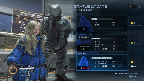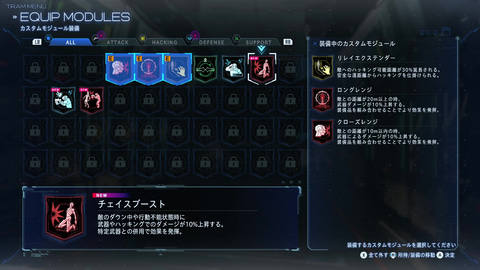 これらの強化に加えて、アタッチメントの強化やカスタムモジュールの装備でハッキング性能や射撃の性能をさらに底上げすることができる。